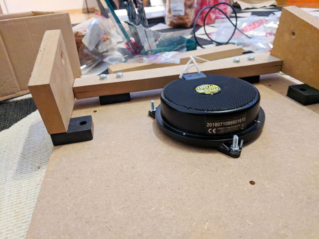 Die Shaker wurden an je einem 10mm MDF Brett befestigt. Die Bretter wurden jeweils mit 2 Löchern versehen und dann zwischen den Stuhl und Sitzschlitten geschraubt. Hierzu mussten die original Schrauben durch 10mm längere ersetzt werden.